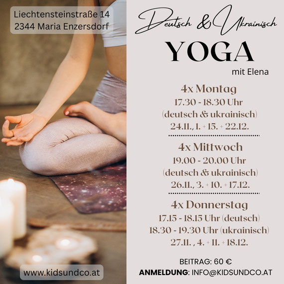 Відкрийте для себе розслаблюючі та зміцнювальні заняття йогою з Оленою у Kids&Co Maria Enzersdorf. Цей курс проводиться двома мовами — німецькою та українською, і чудово підходить як для початківців, так і для тих, хто має базовий досвід.