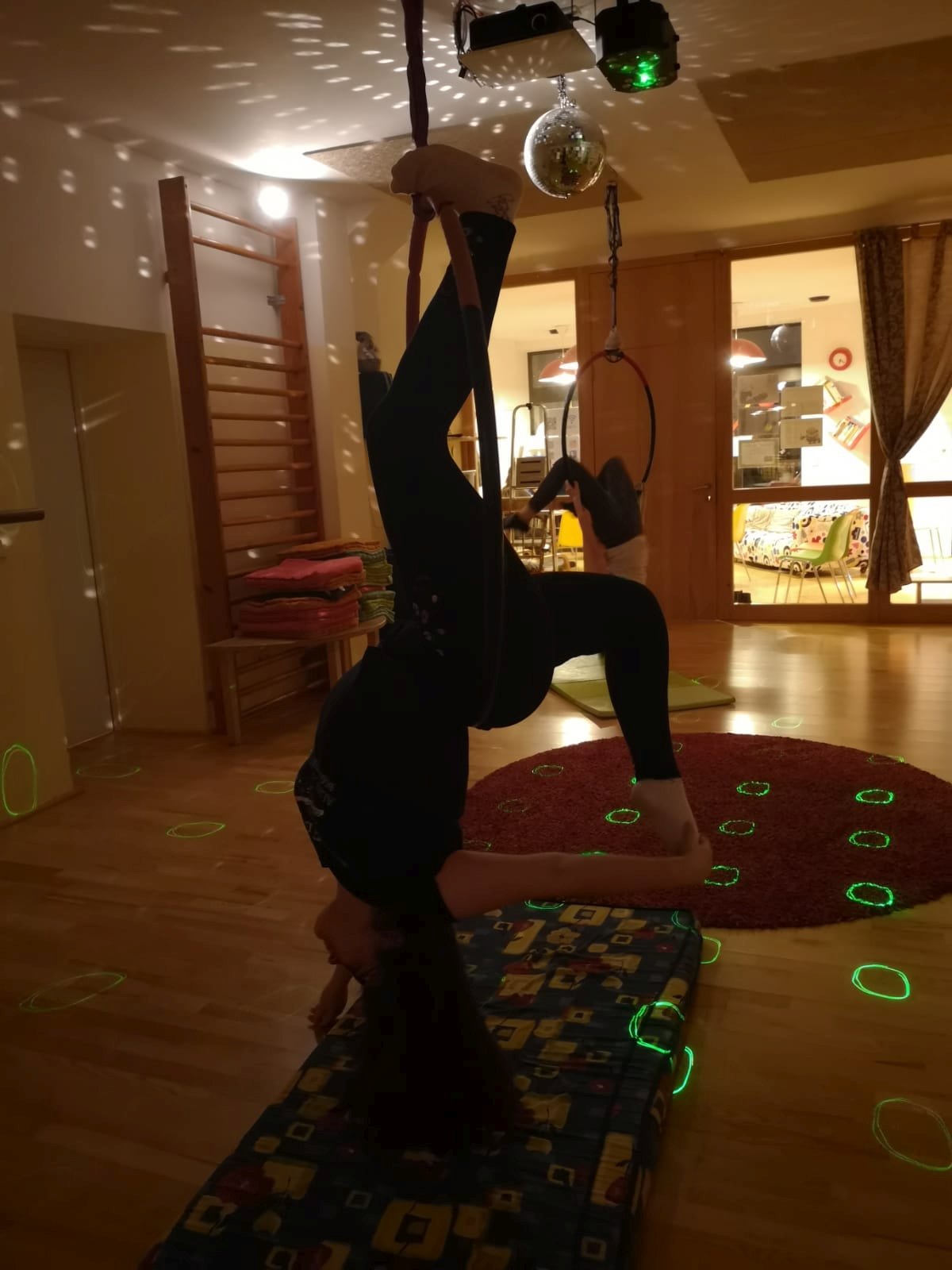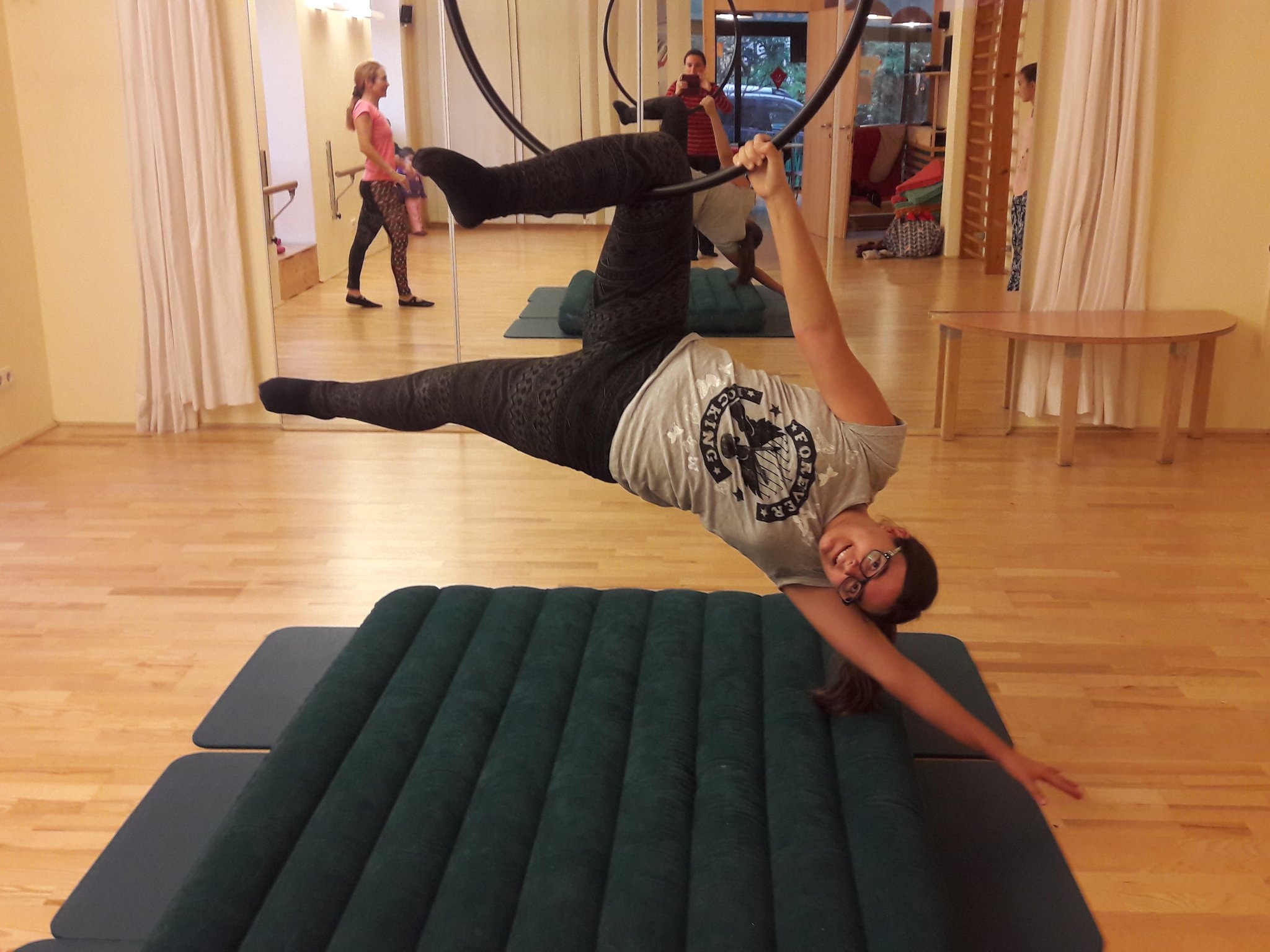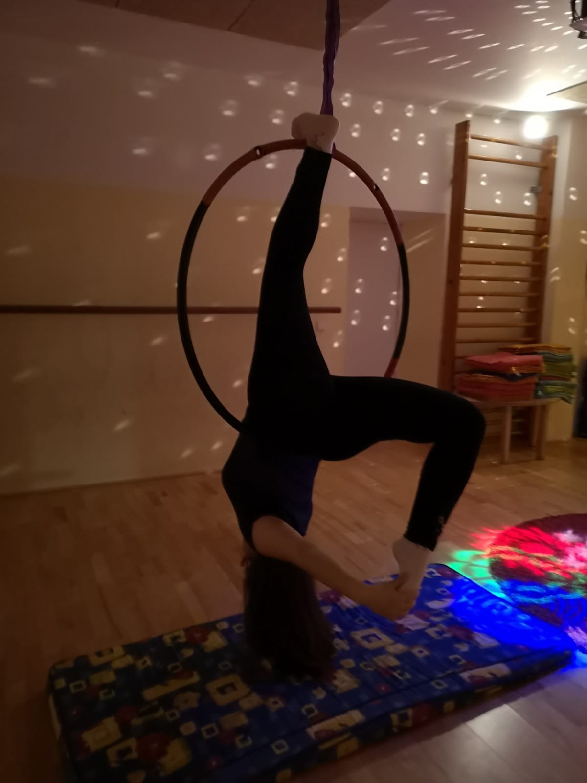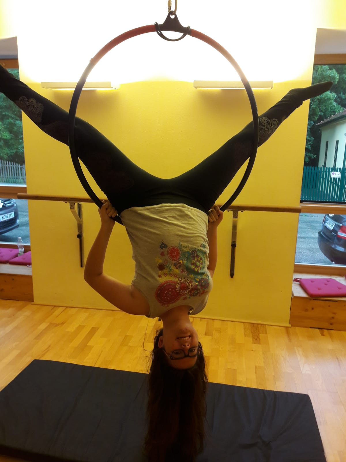 Aerial Hoop ein Stahlring, der von der Decke hängt und mit dem verschiedenste, artistische Figuren durchgeführt werden können. Der gesamte Körper wird beansprucht sowie Koordination und Flexibilität gefördert.