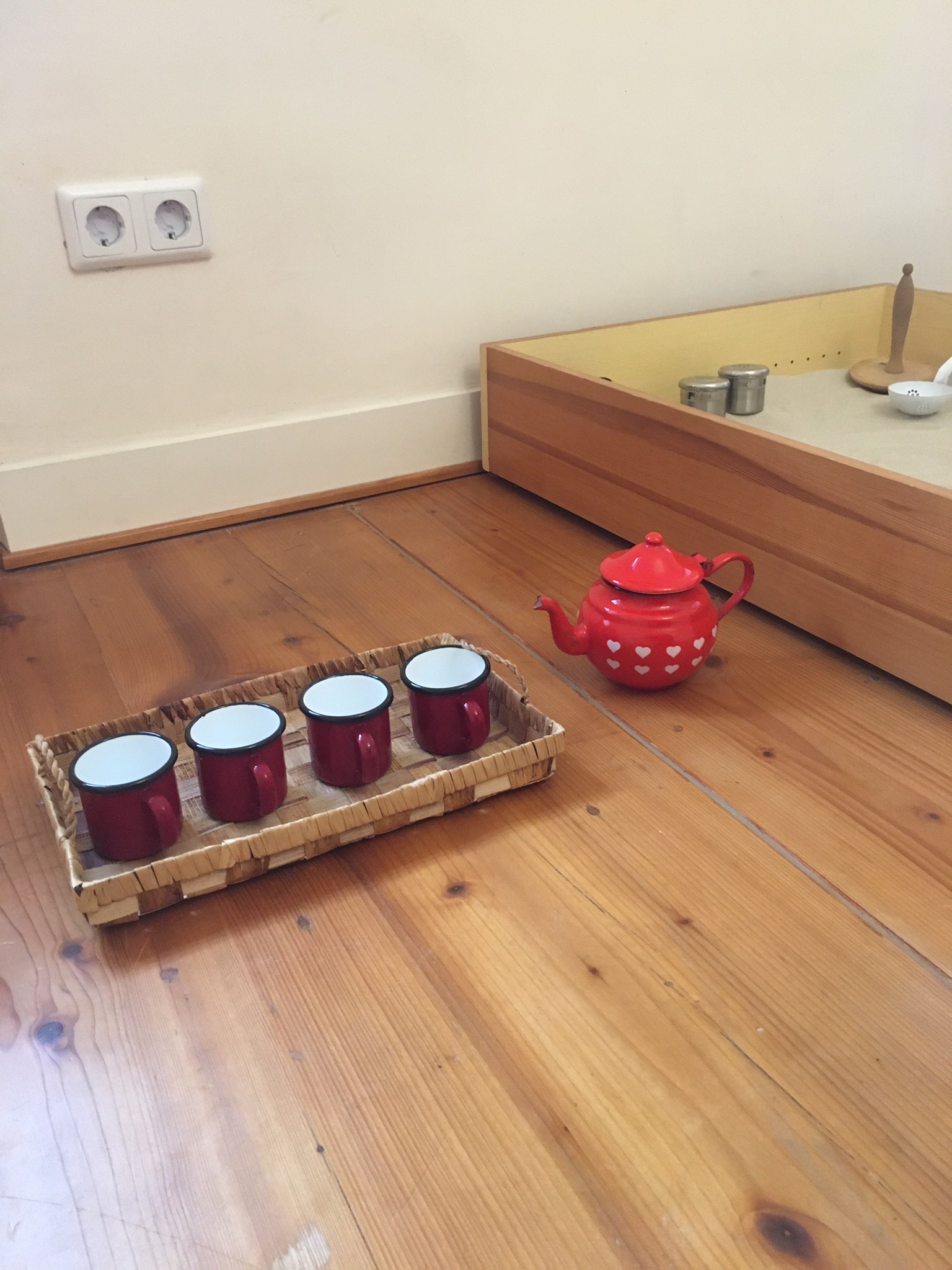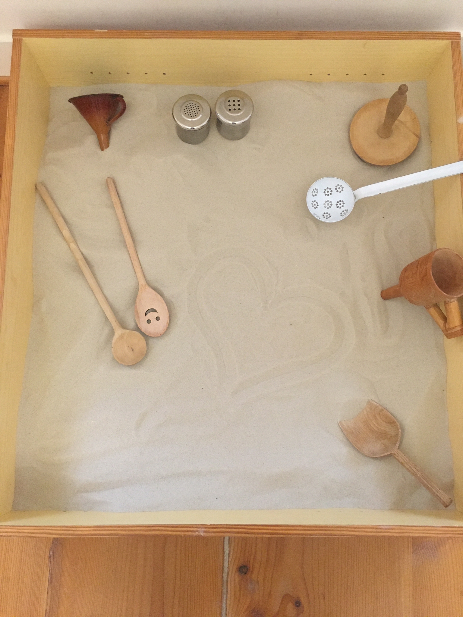Sand in Körben, in großen Schüsseln, in kleinen Gefäßen und Wannen – mit hochwertigen Schüttmaterialien oder mit den Händen – die vorbereitete Umgebung lädt zum freien Experimentieren und